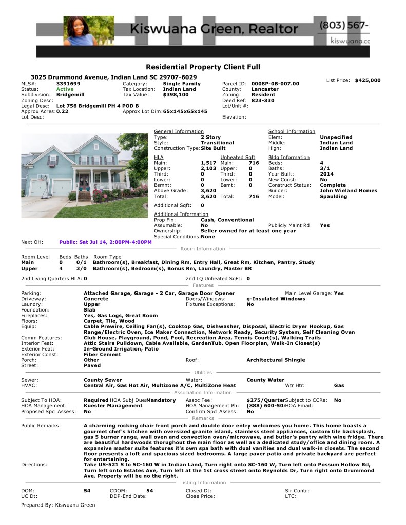 Open House: 3025 Drummond Avenue, Indian Land SC 29707 Saturday 7/14 2-4pm